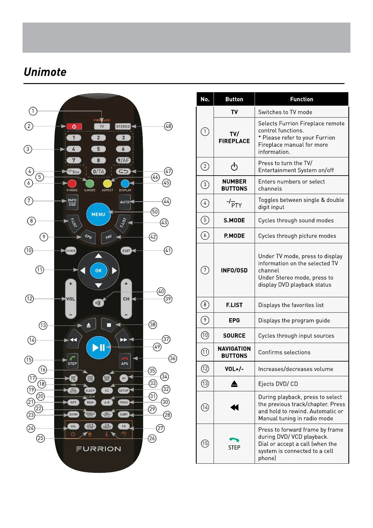 Furrion FEHS28CAA - Remote Control Button Functions