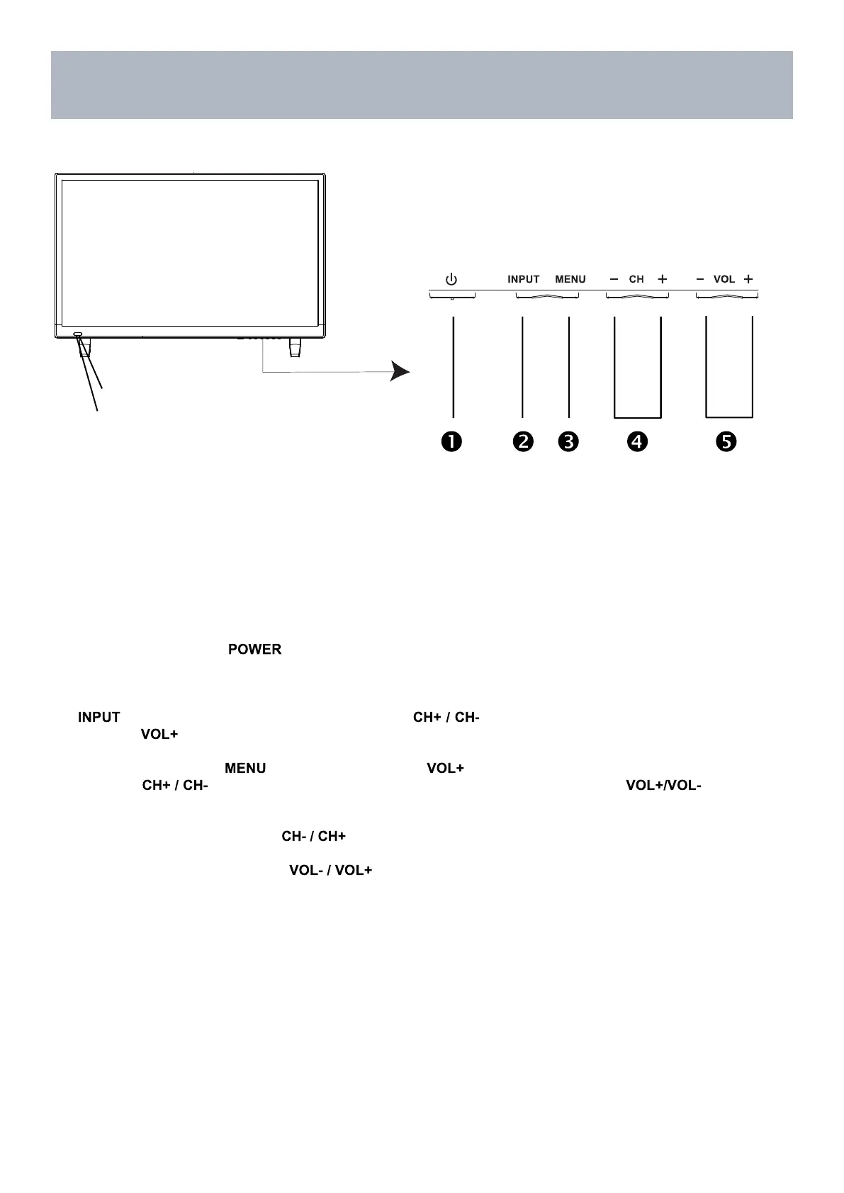 4. Channel (-CH+) - Press the buttons to select a channel in the TV mode.