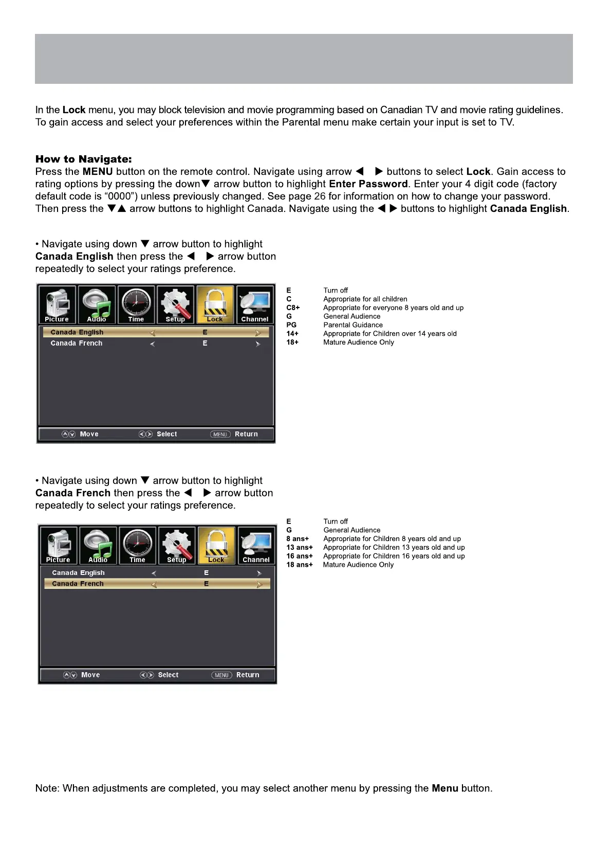 Furrion FEHS28CAA - Parental Control Settings (Canada)