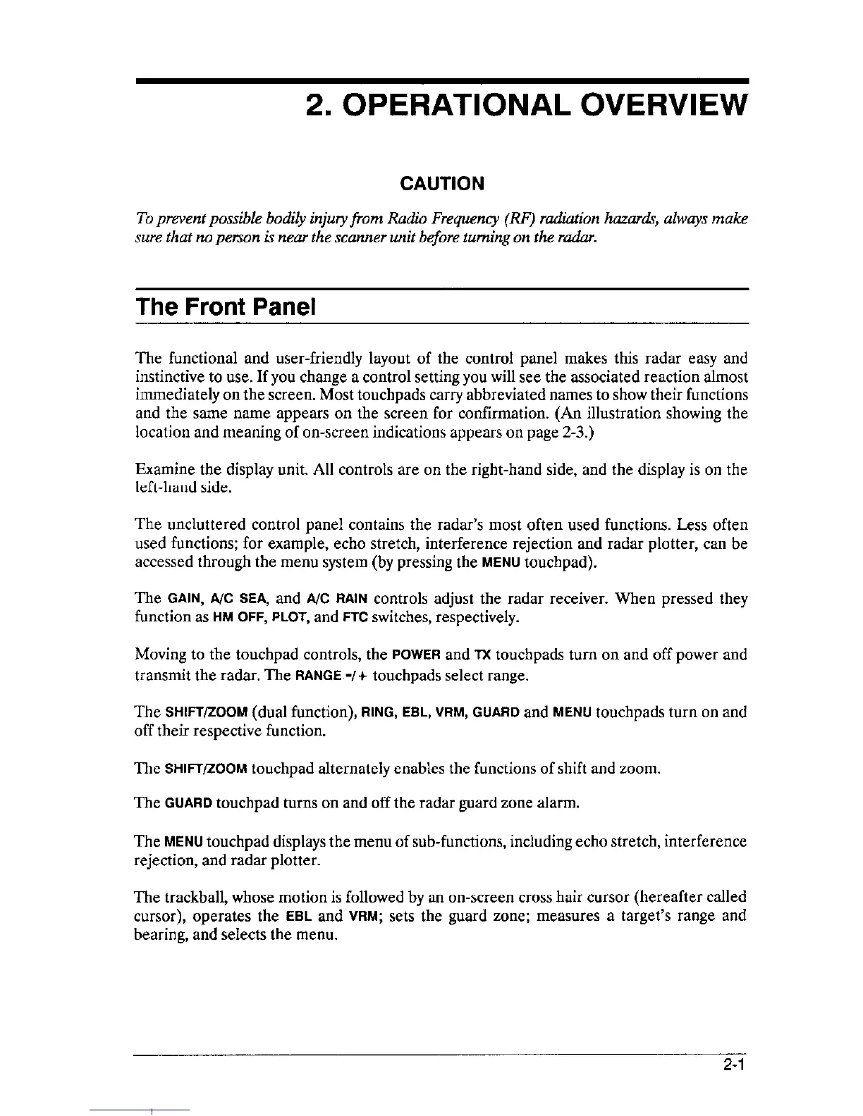 Furuno 1721 - 2. OPERATIONAL OVERVIEW; THE FRONT PANEL