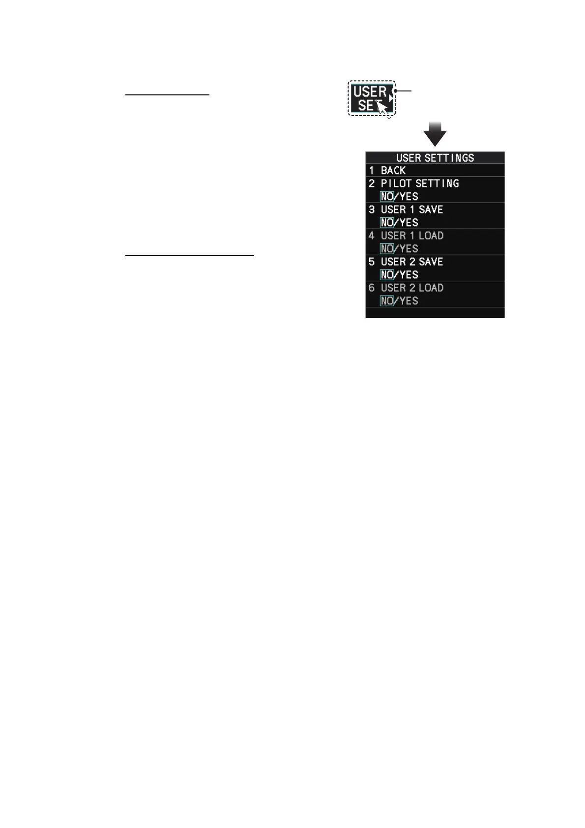 4. Select [USER1(2) LOAD] or [USER1(2) SAVE] to recall or save user settings, re-