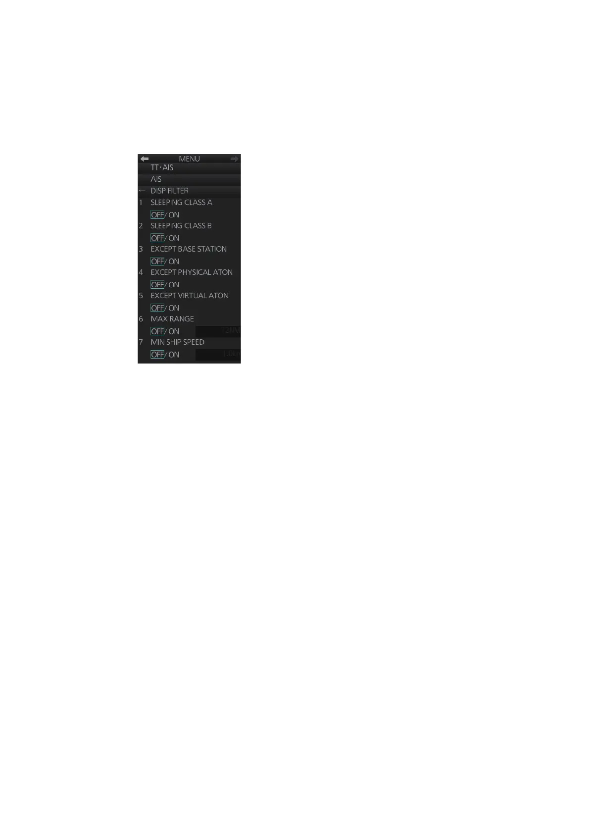 5. Set the minimum ship speed for AIS targets, with [7 MIN SHIP SPEED]. Any AIS