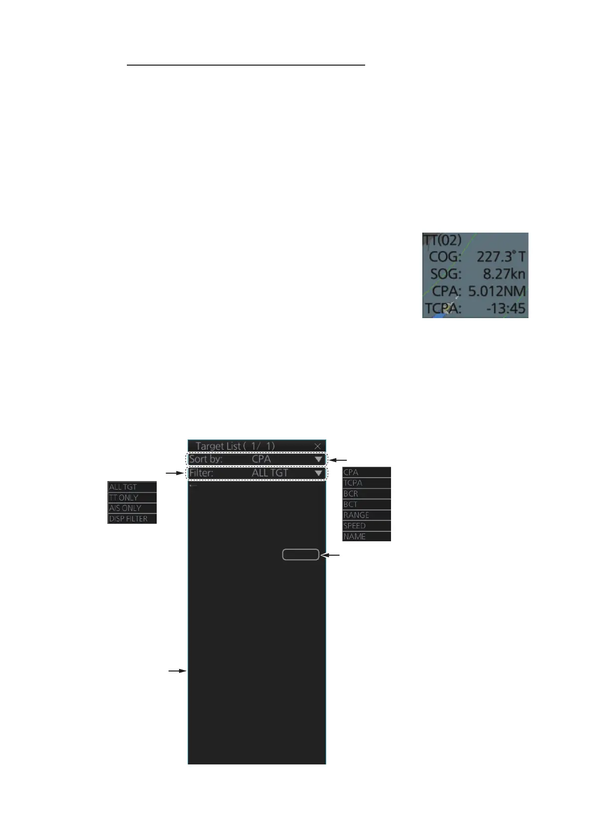 The target list shows the data for all tracked targets and AIS targets. To show the list,