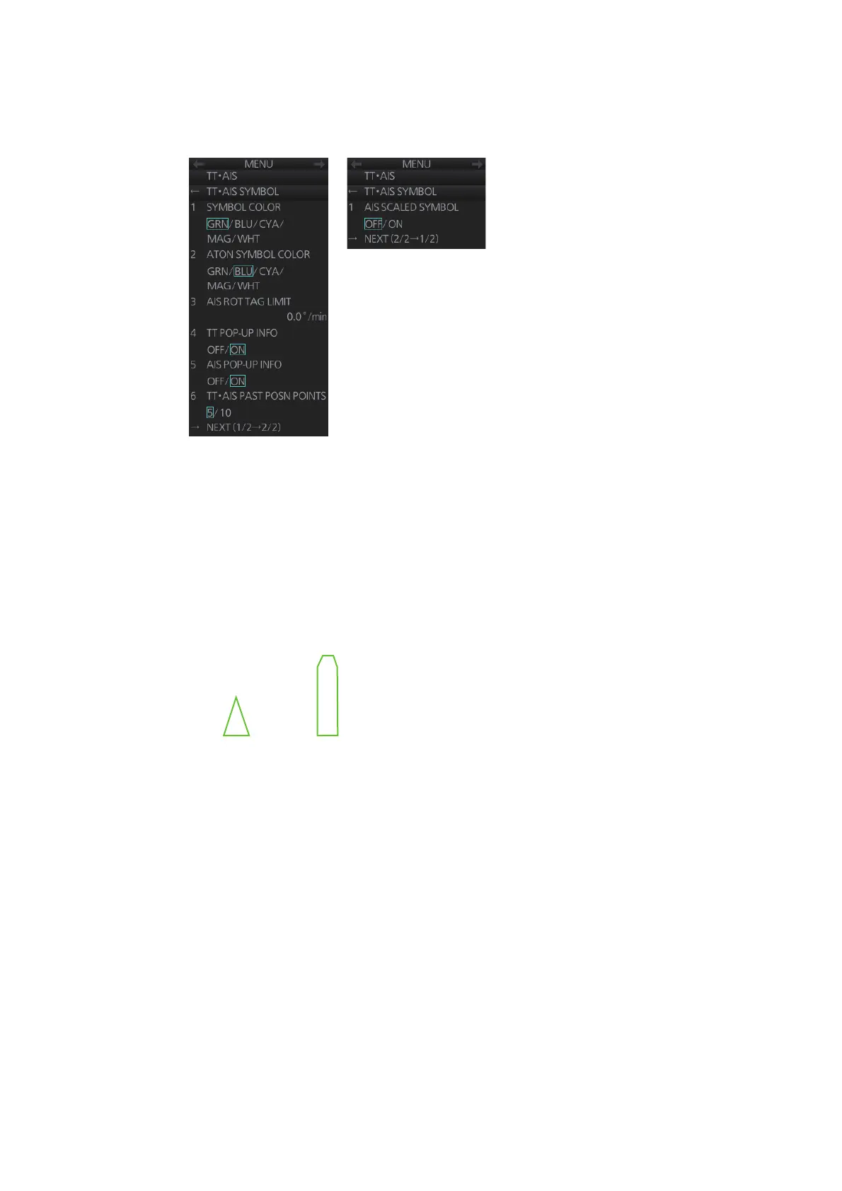 or a symbol scaled according to a vessels’ dimensions. Select [ON] to show the scaled