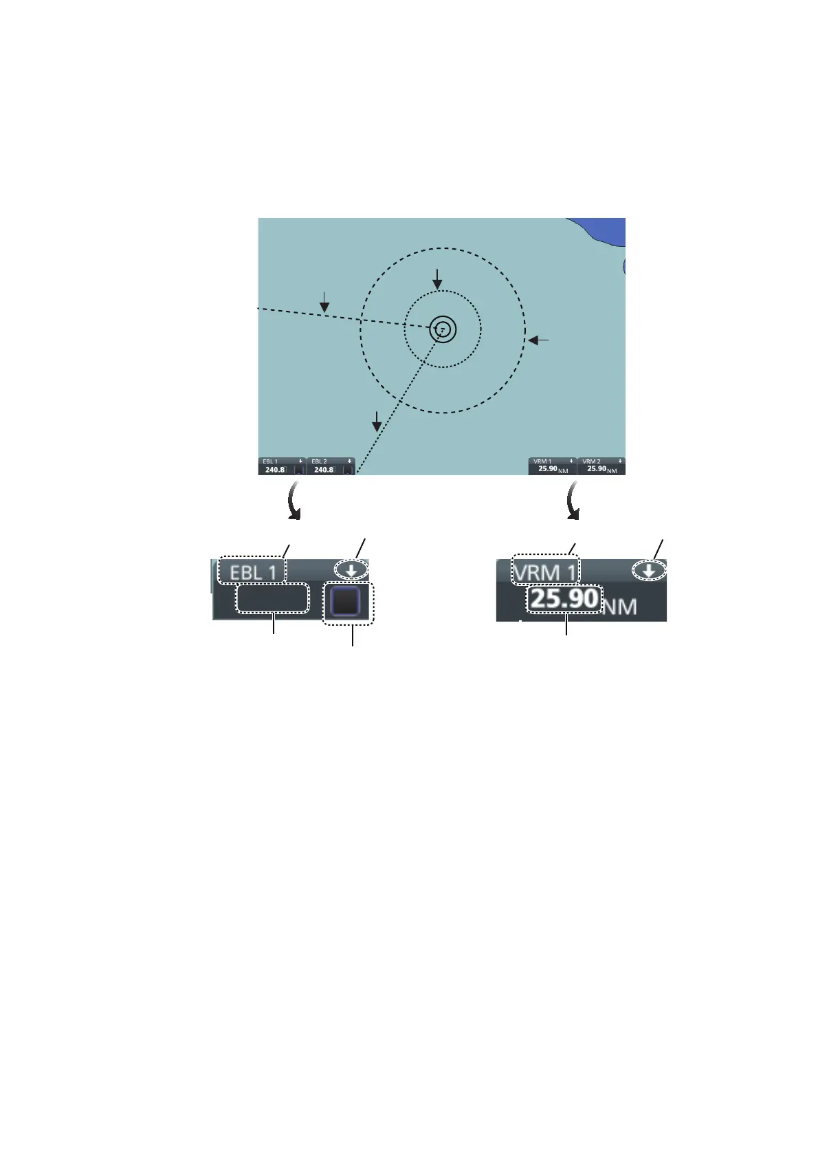 object. There are two each of VRMs and EBLs. The lengths of the dashes on the EBL2