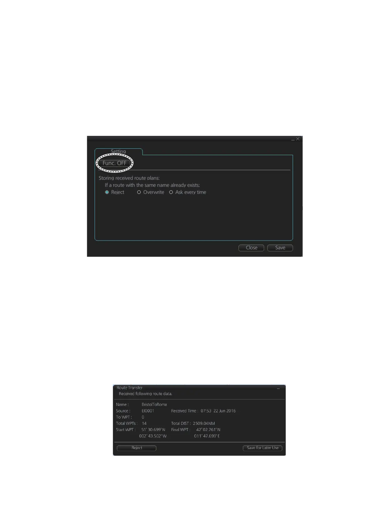 • [Reject]: Don’t save received route data. When route data is being received, a pop-