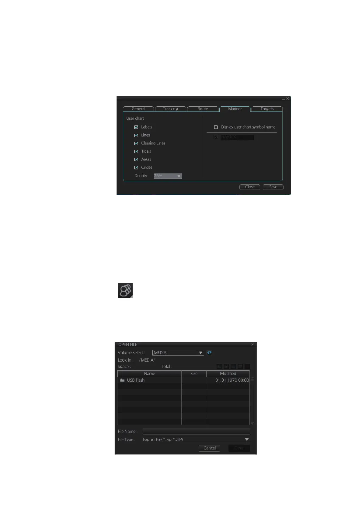 User charts can be displayed on the electronic chart. Open the [Mariner] page in the