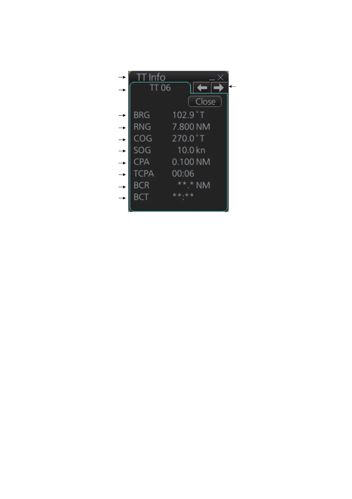 • Bearing (BRG) and distance (RNG) of the target from own ship