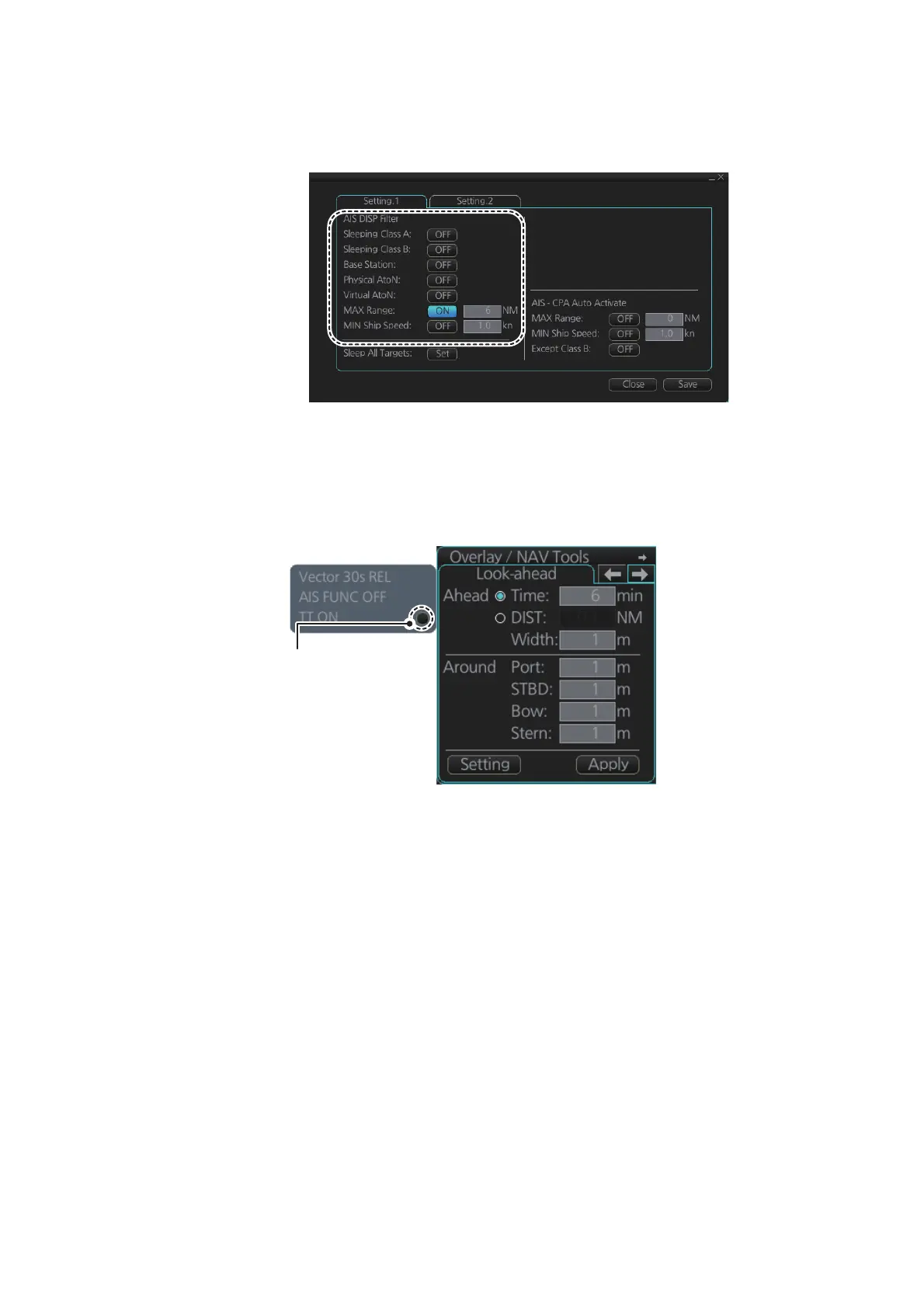 • Set the ship speed for AIS targets, with [MIN Ship Speed]. Any AIS target
