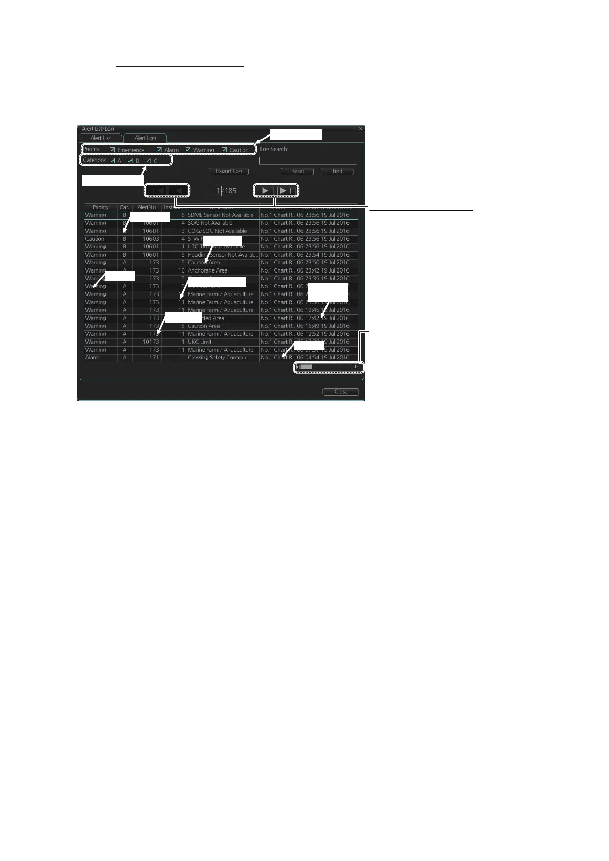 You can select what type of alerts to display with [Priority Filter] and [Category Filter]
