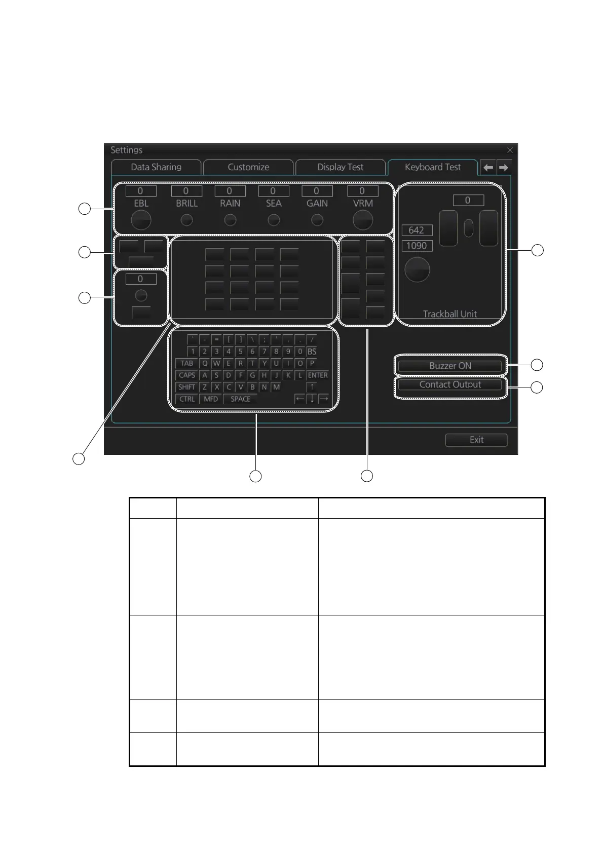 The [Keyboard Test] page checks the controls and keys on the Radar Control Unit and