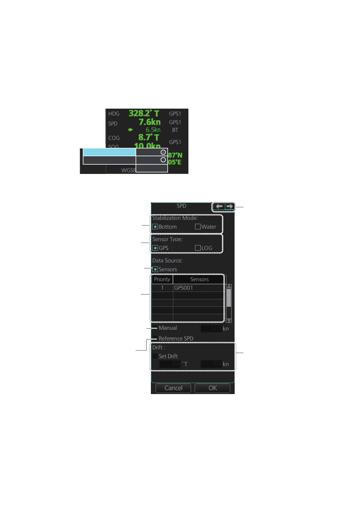 SOG) or GPS (SOG), or manually on the menu. Note that the FURUNO GPS Naviga-