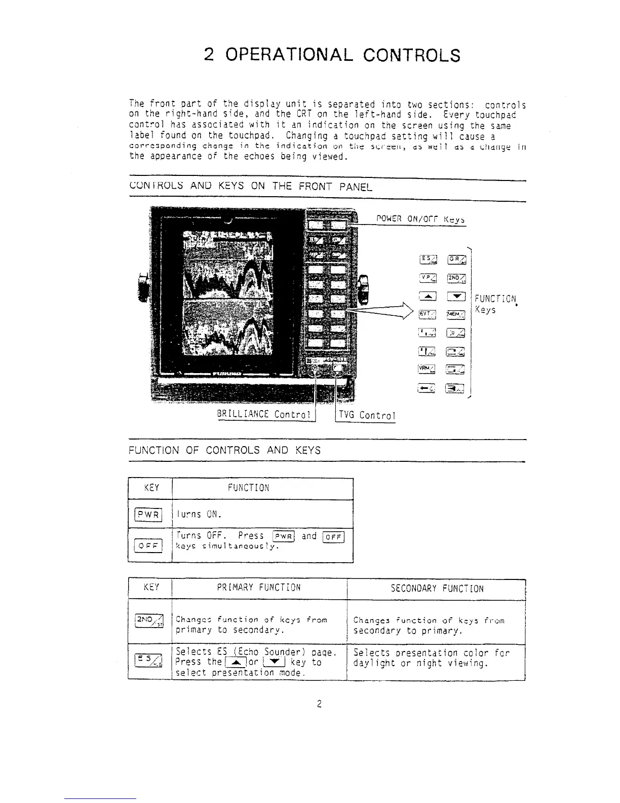 Furuno FCV-552 - 2 OPERATIONAL CONTROLS; CONTROLS AND KEYS ON THE FRONT PANEL; FUNCTION OF CONTROLS AND KEYS