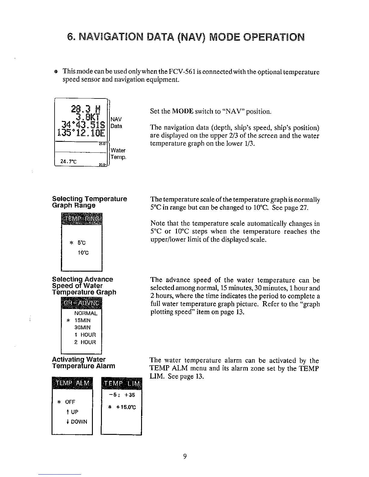 Furuno FCV-561 - Navigation Data (Nav) Mode Operation; Selecting Temperature Graph Range; Selecting Advance Speed of Water Temperature Graph; Activating Water Temperature Alarm
