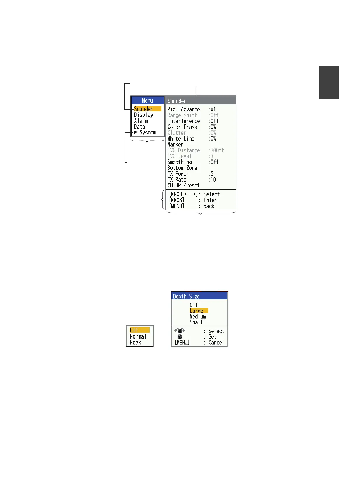 Your fish finder has five main menus: [Sounder], [Display], [Alarm], [Data], and [Sys-