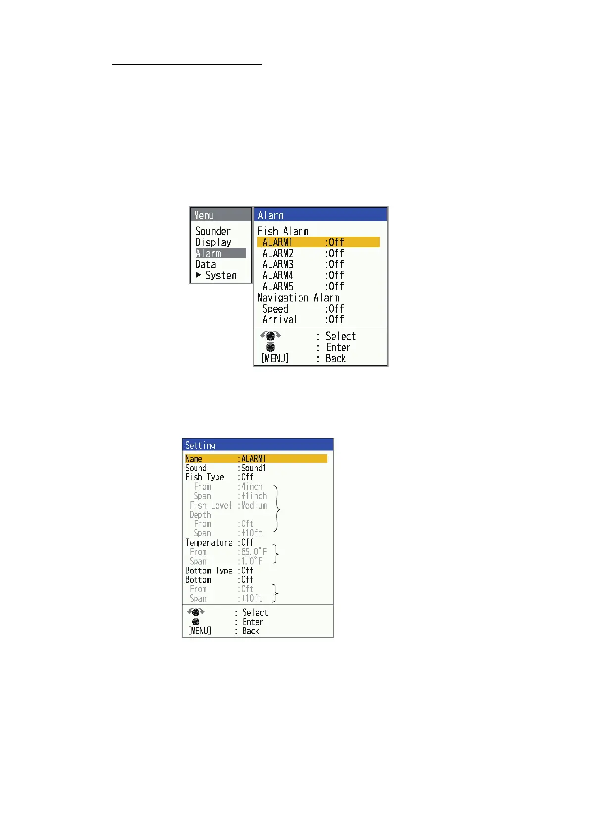 example, the [Bottom Type] alarm is set for [Rock] and the [Bottom] alarm is set for
