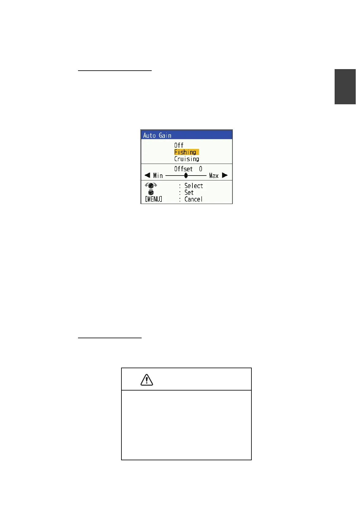 The gain may be adjusted automatically ([Fishing] or [Cruising]) or manually.