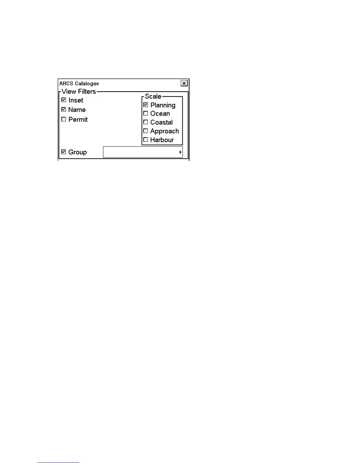 the ARCS Catalogue window opens in the electronic chart area and the ARCS Catalogue dialog box appears in the