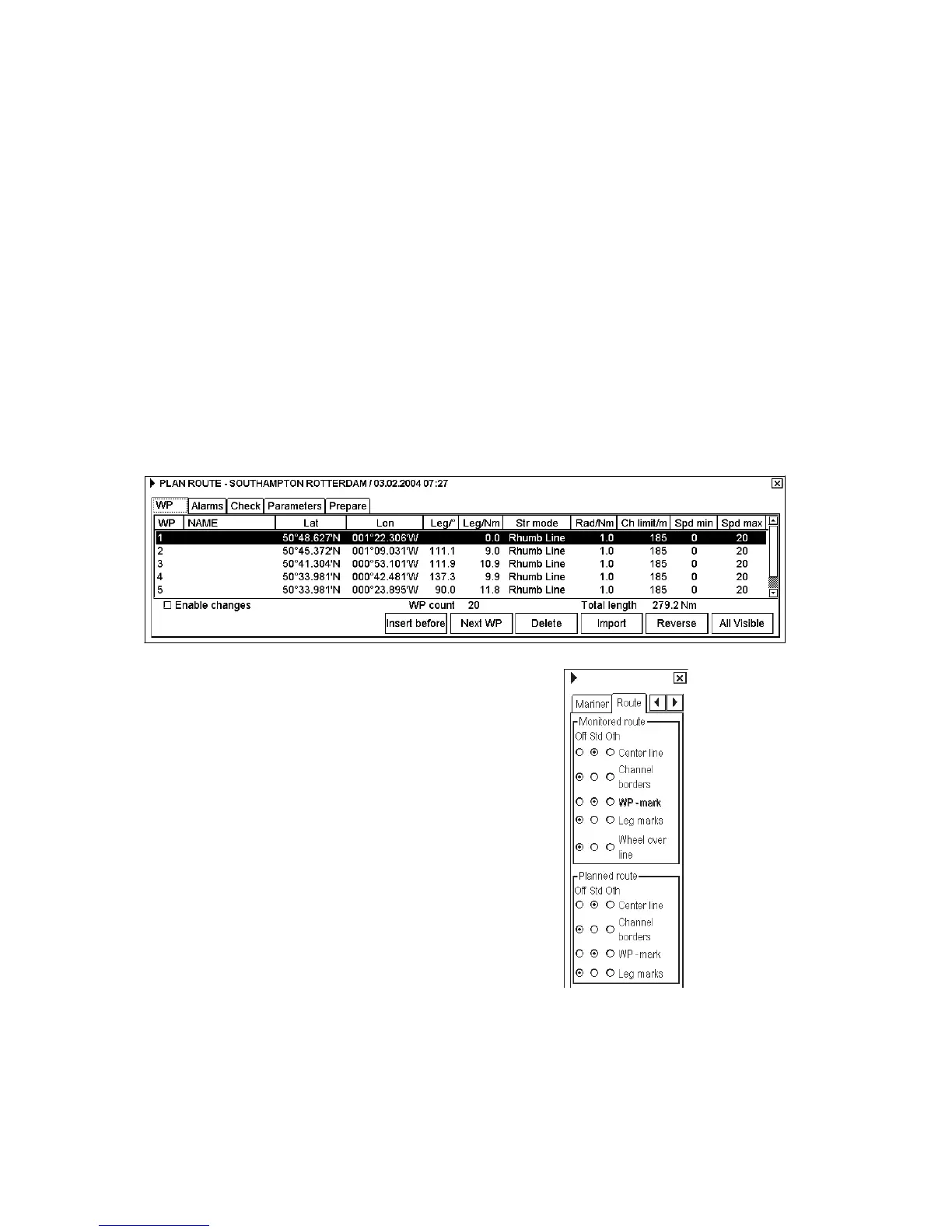 Note: To display a planned route, make sure that desired options of the planned route (Center line, Channel borders,