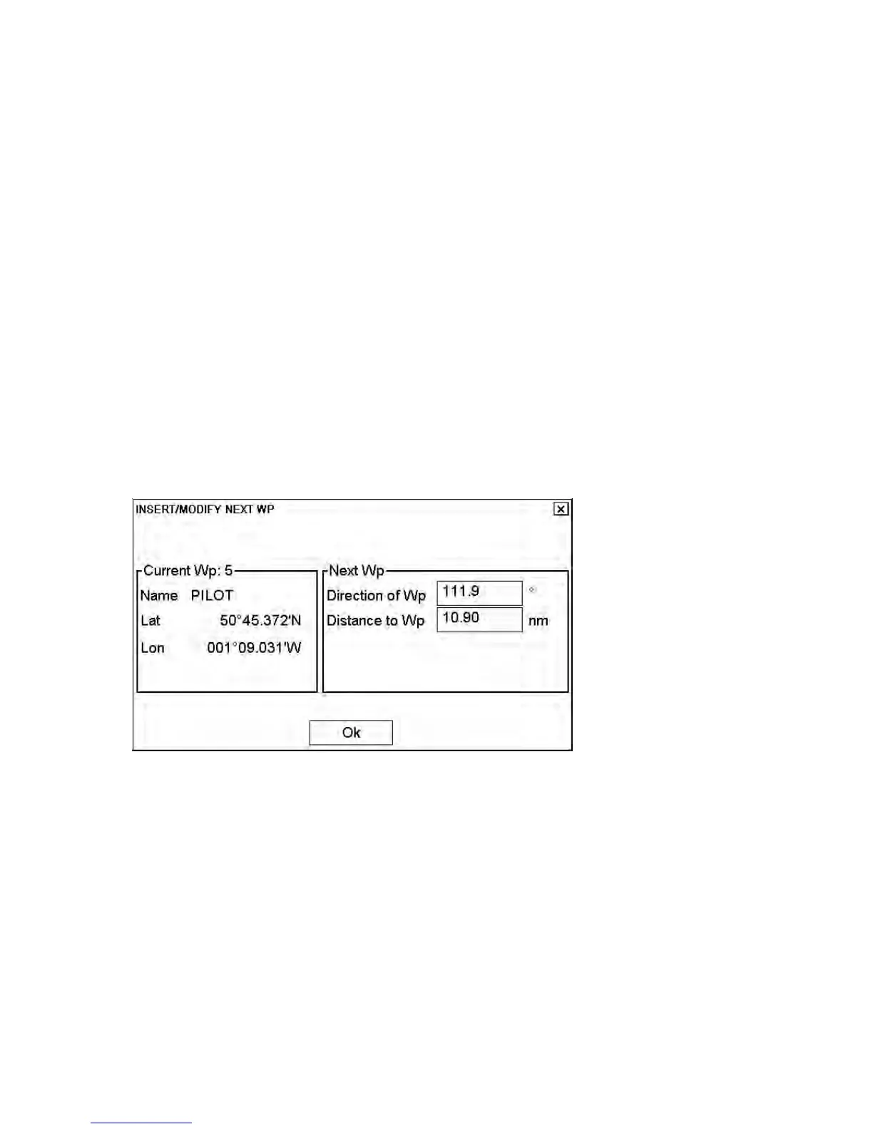 3. Click the Next WP button in the Waypoints page. Enter direction and distance for waypoint then click the OK