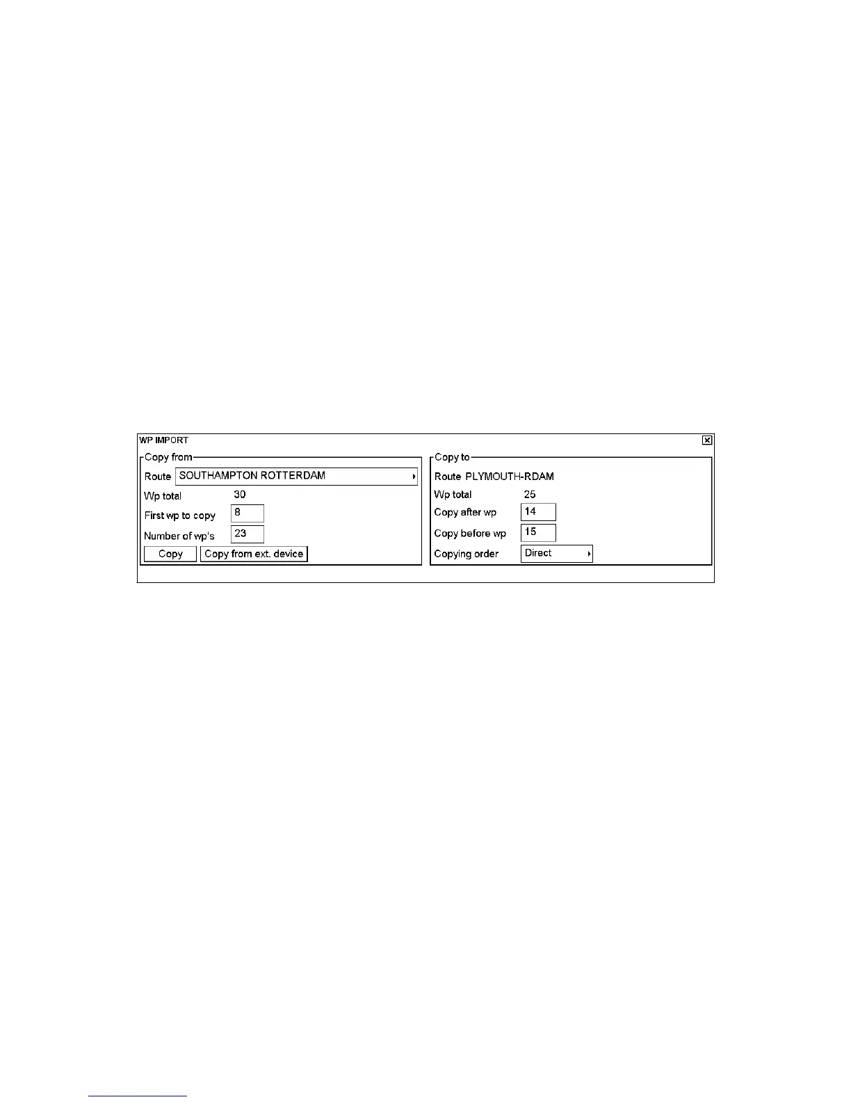 6. Enter where to import waypoints. To enter them after a WP in a route, enter waypoint number in the "Copy