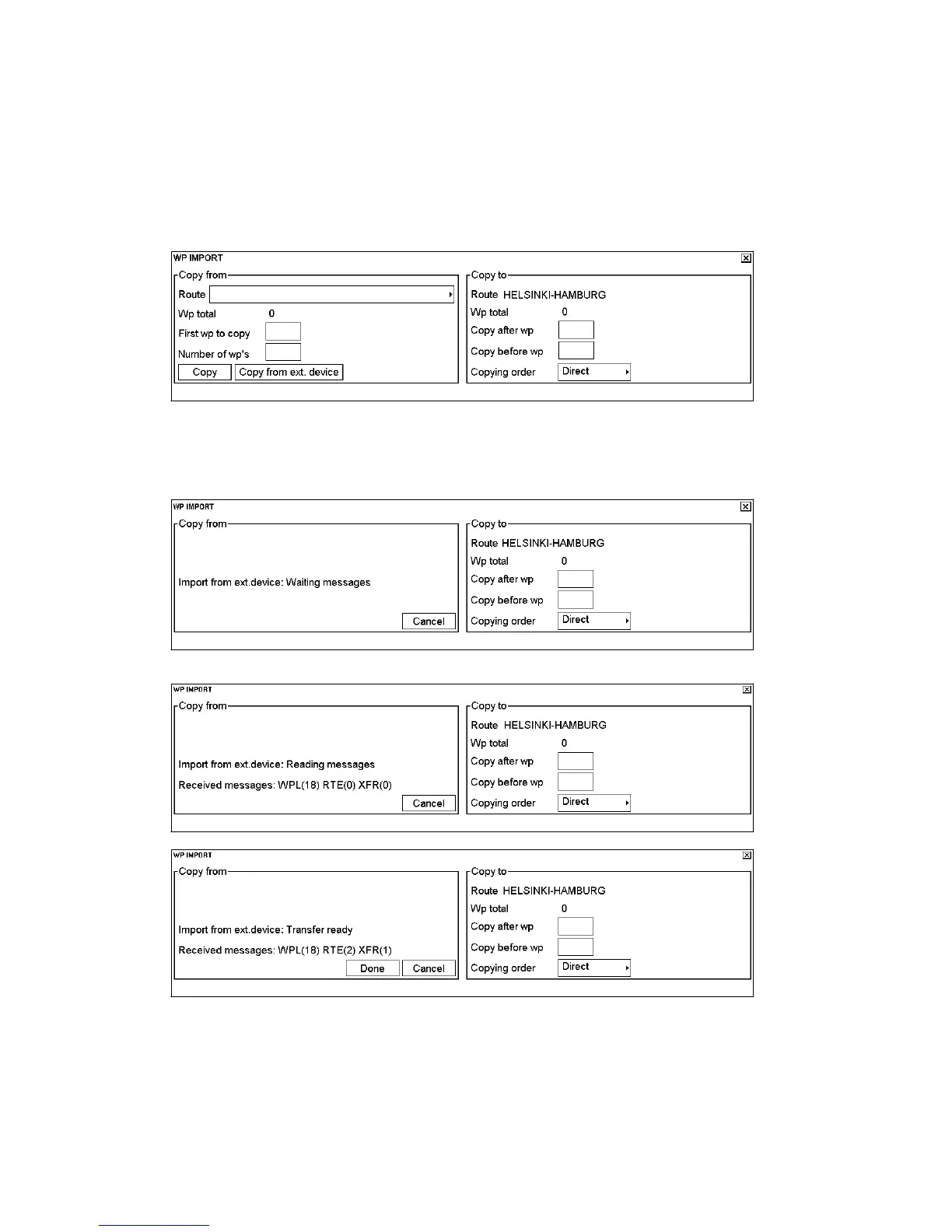 When text "Import from ext. device: Waiting messages" appears, you can start importing WPs from a GPS