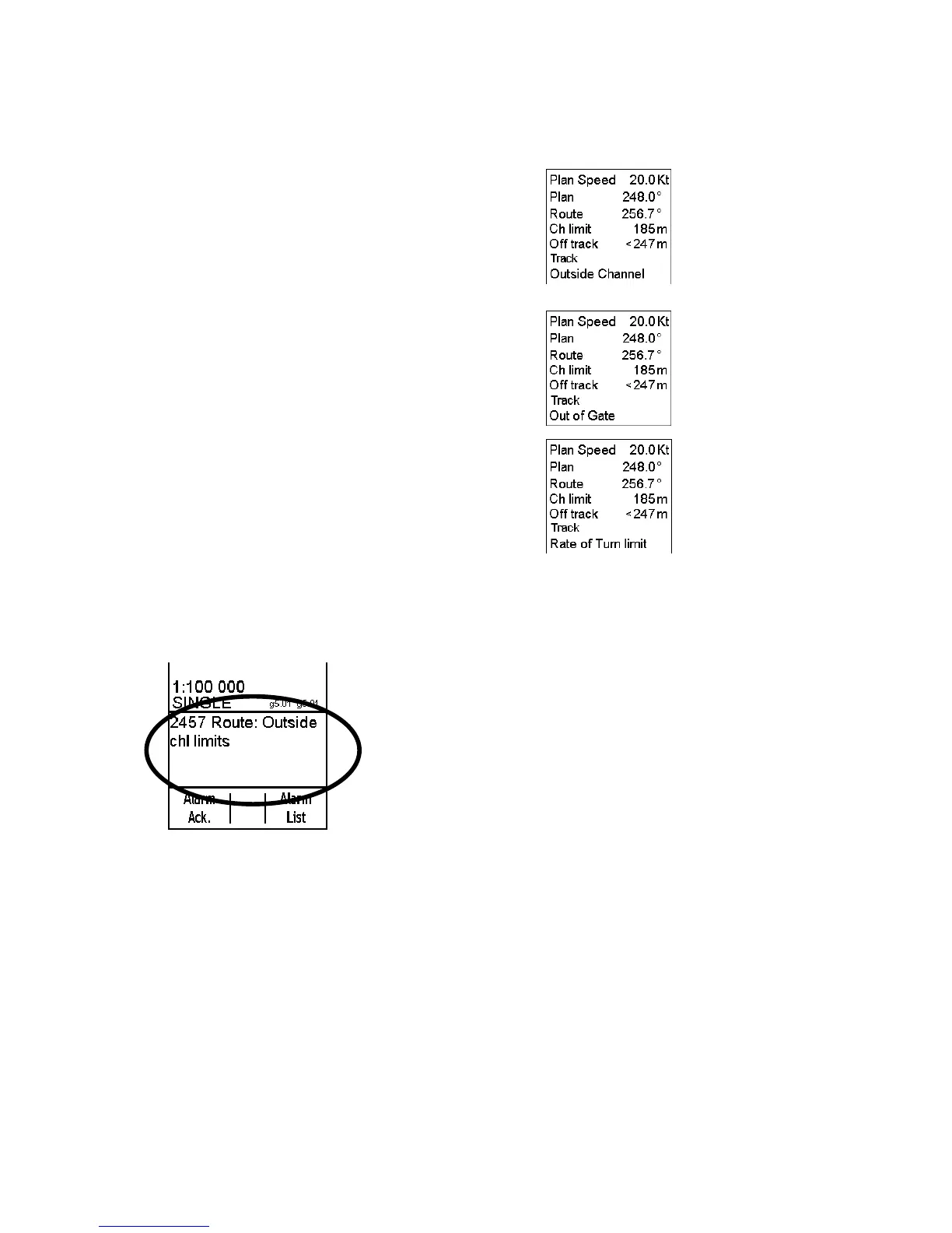 Alarm "2457 Route: Outside chl limit" appears when your ship is outside the planned channel.