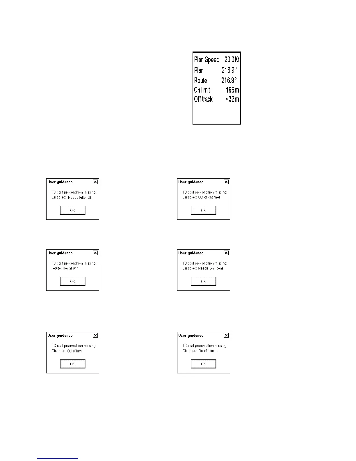 ECDIS, user guidance may appear if preconditions are not fulfilled. The user guidance window may appear when