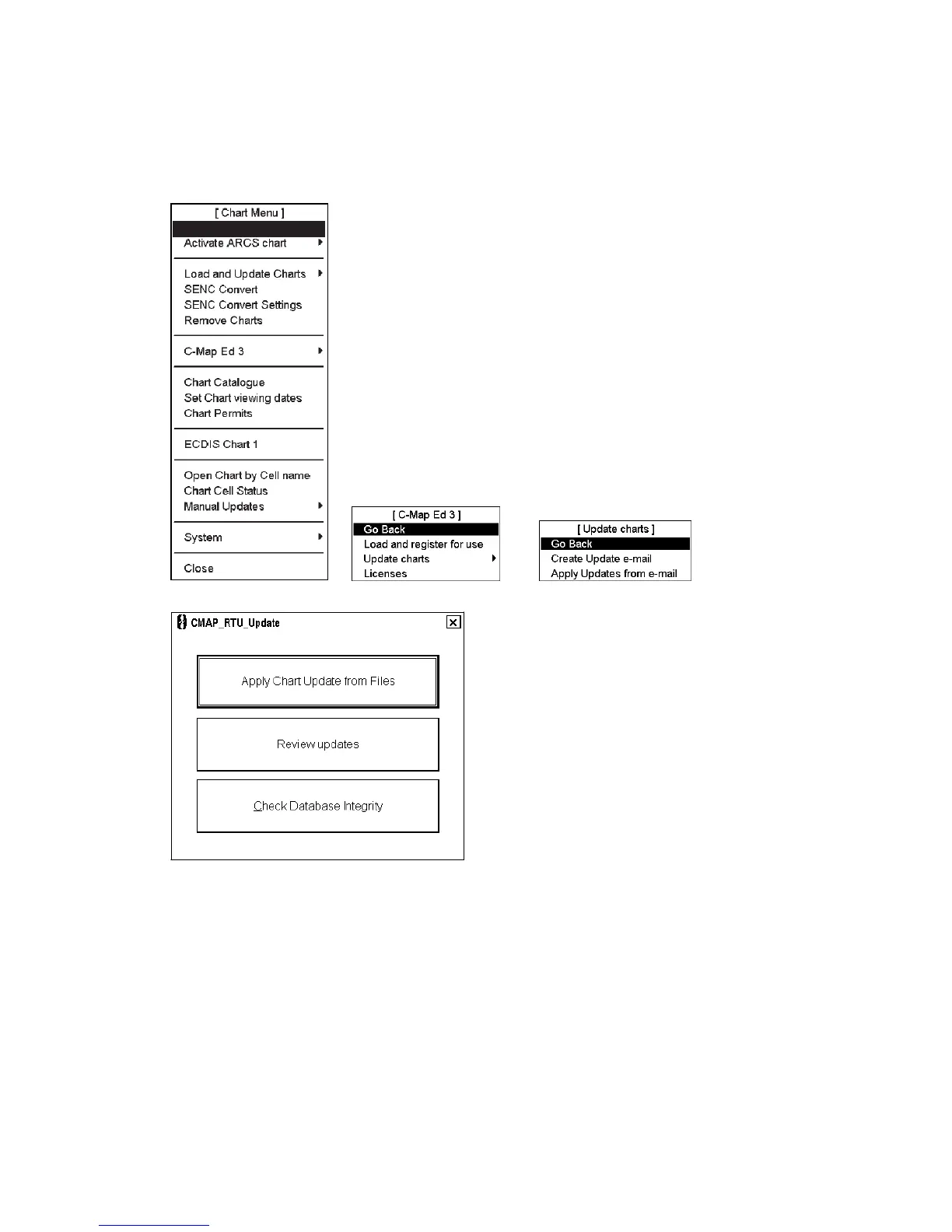 1. Open the Chart menu and select C-MAP Ed 3 in the menu. Select Update Charts in C-MAP Ed 3 menu and