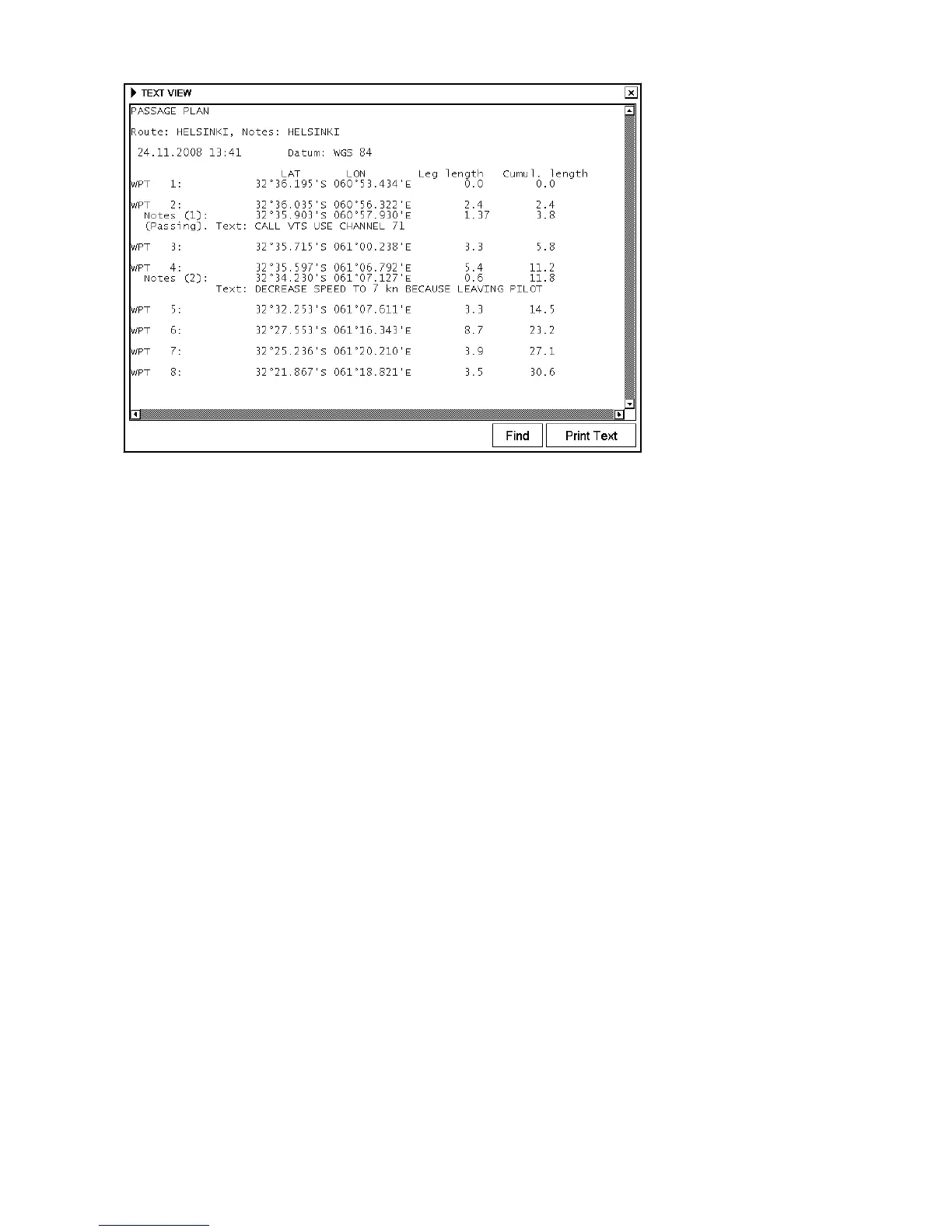 An example of a passage plan report. Notes text notes are placed between waypoints based on their position (in