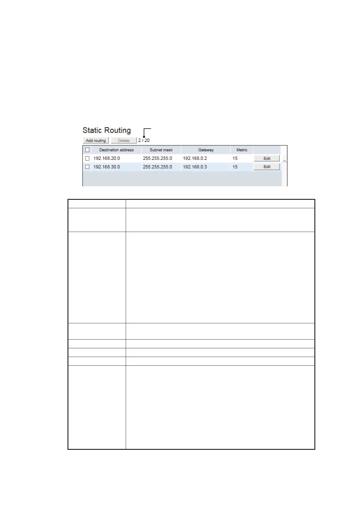 Add routing button Input the new static routing information. A maximum of 20 can be