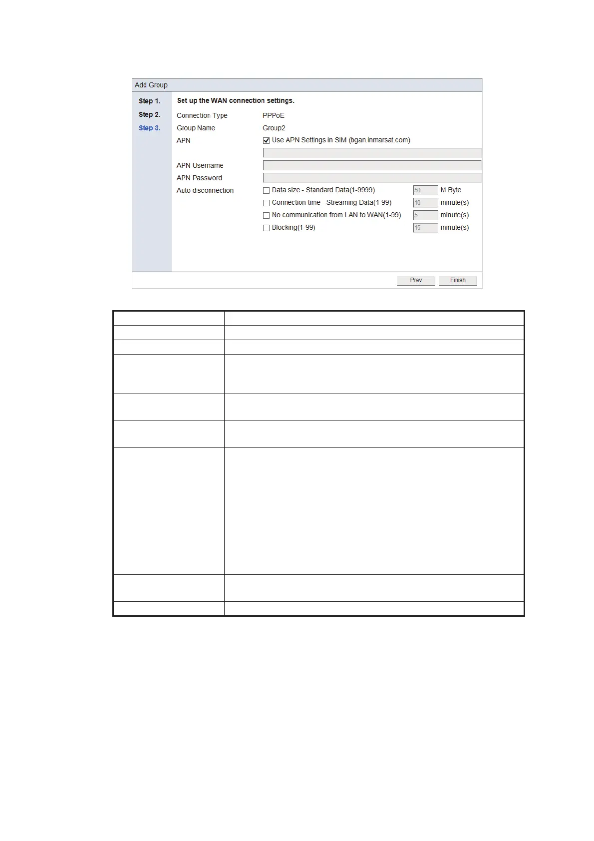 8. Referring to the table below, set up the WAN connection settings.