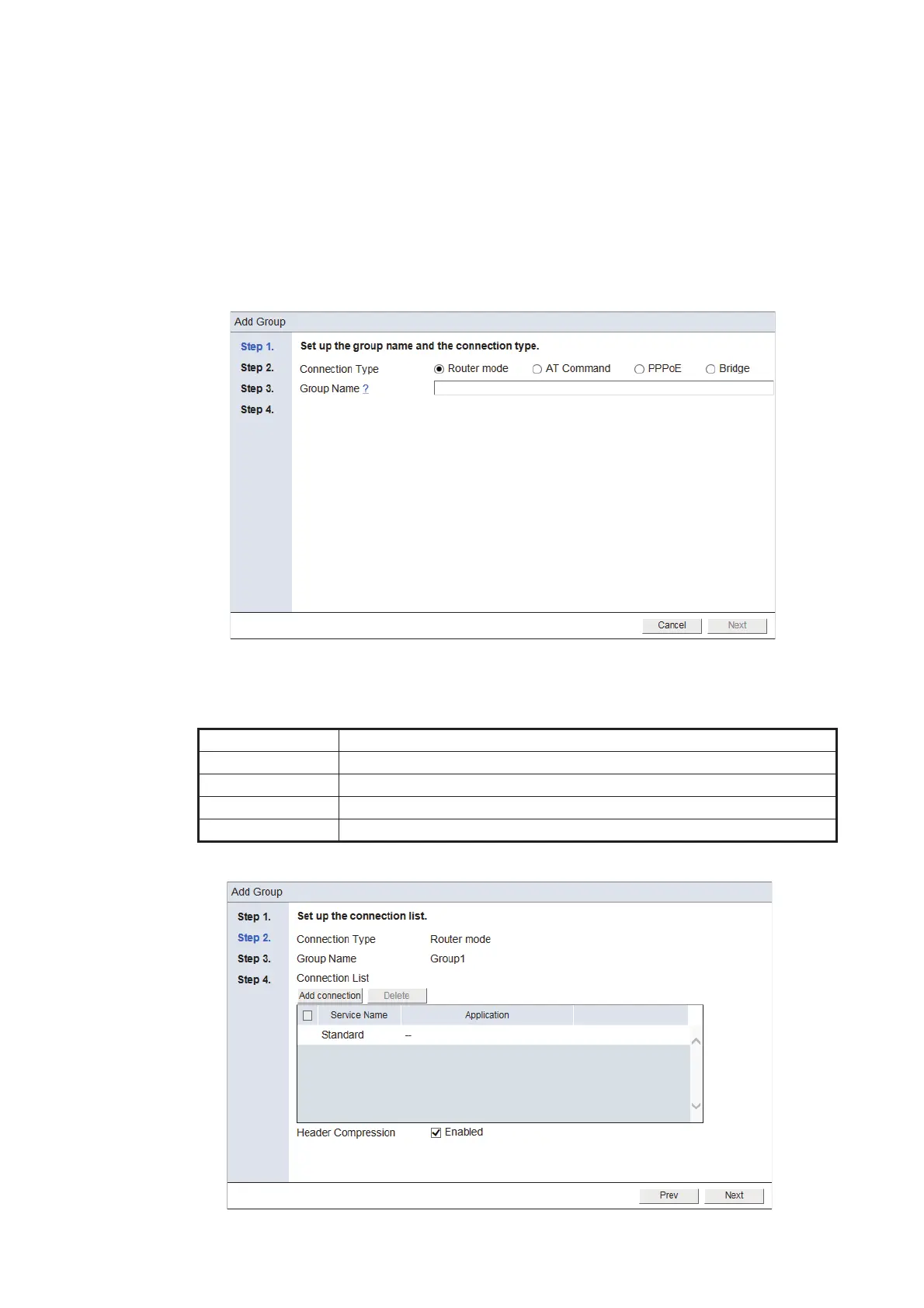4. Referring to the following table, set up the connection type and the group name.