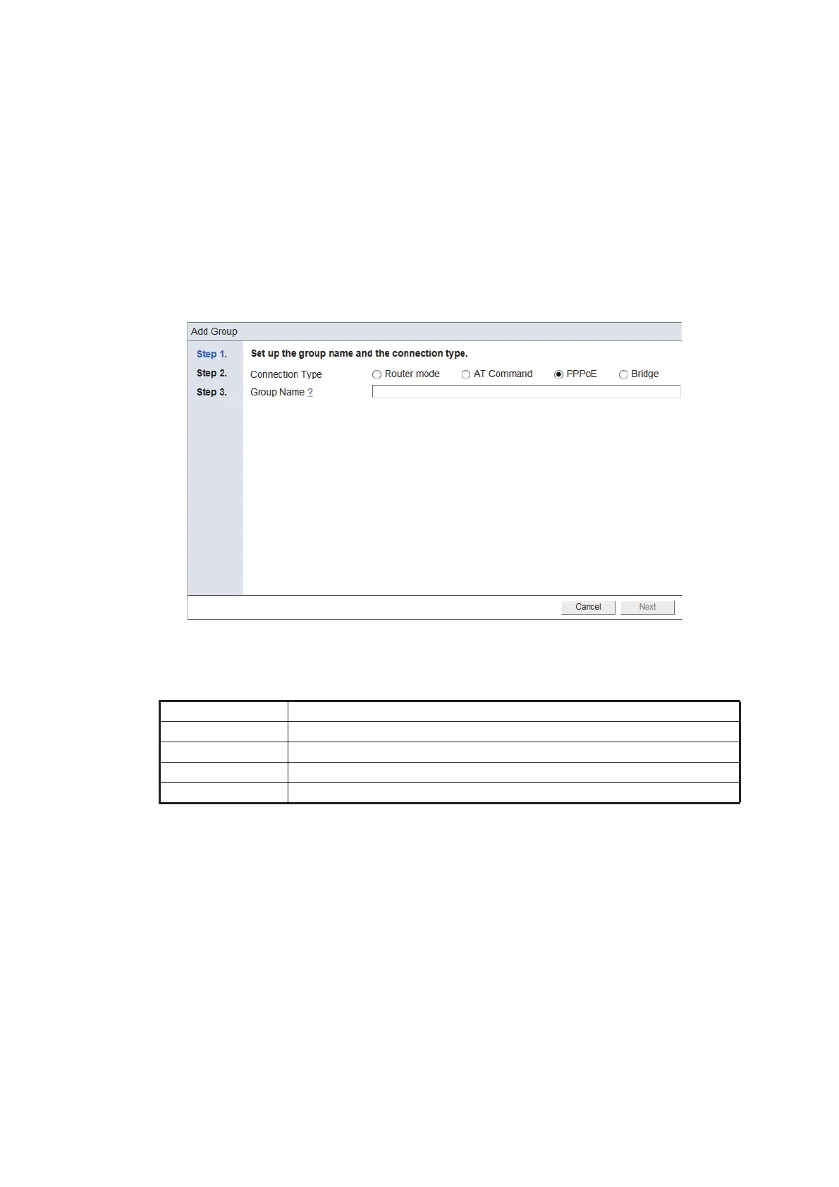 4. Referring to the following table, set up the connection type and the group name.