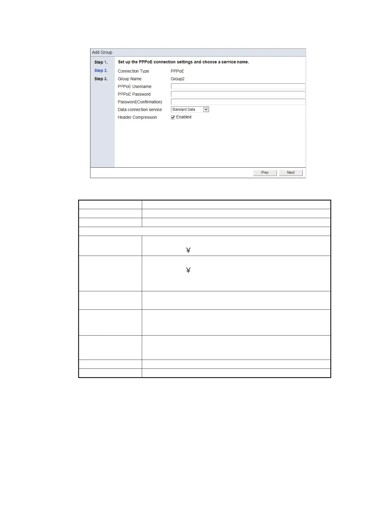 6. Referring to the following table, set up the PPPoE connection settings and choose