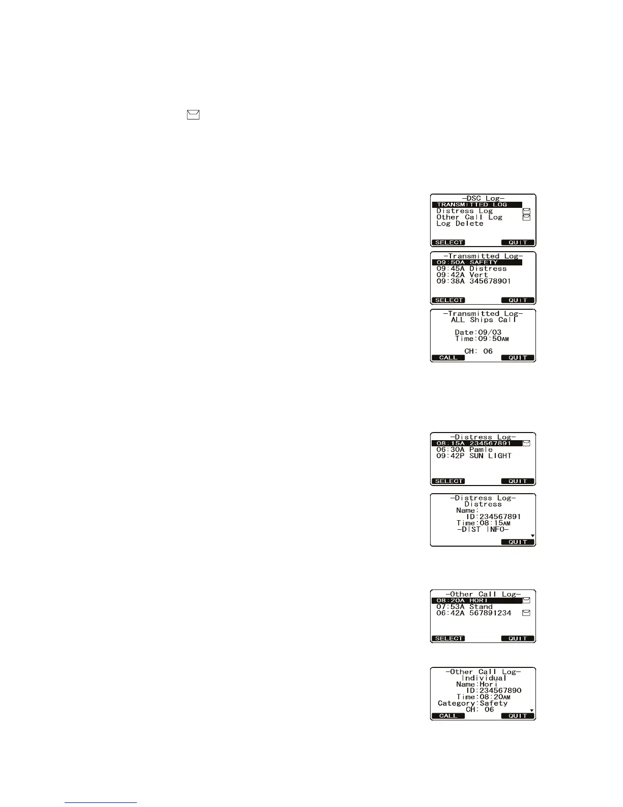 The FM-4721 logs transmitted calls, received distress calls, and Individual calls. The
