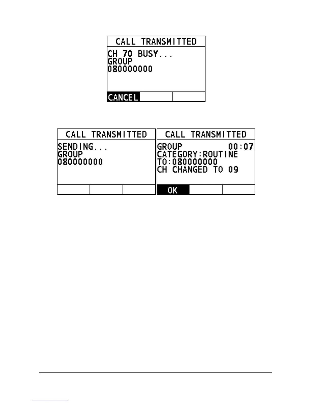 When the CH70 is idle, the following screens appear, and the radio
