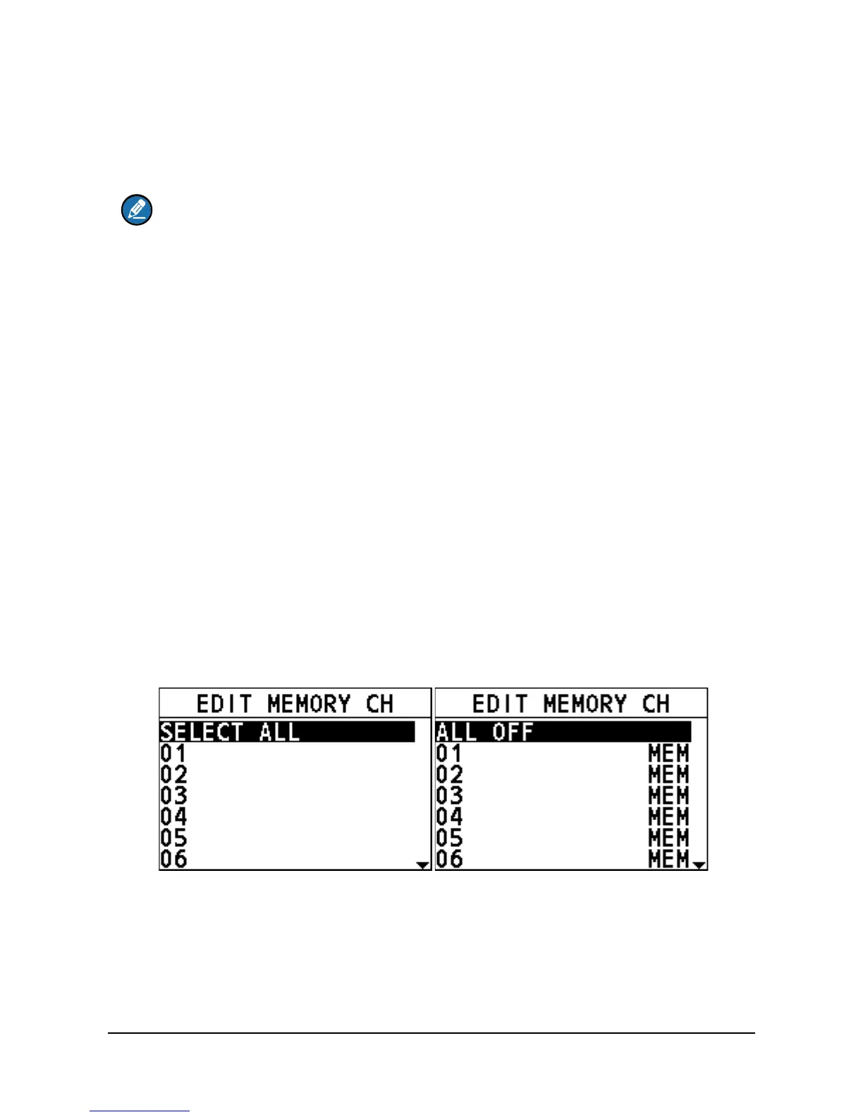 Step 2 Go to "SCAN > EDIT MEMORY CH > SELECT ALL".