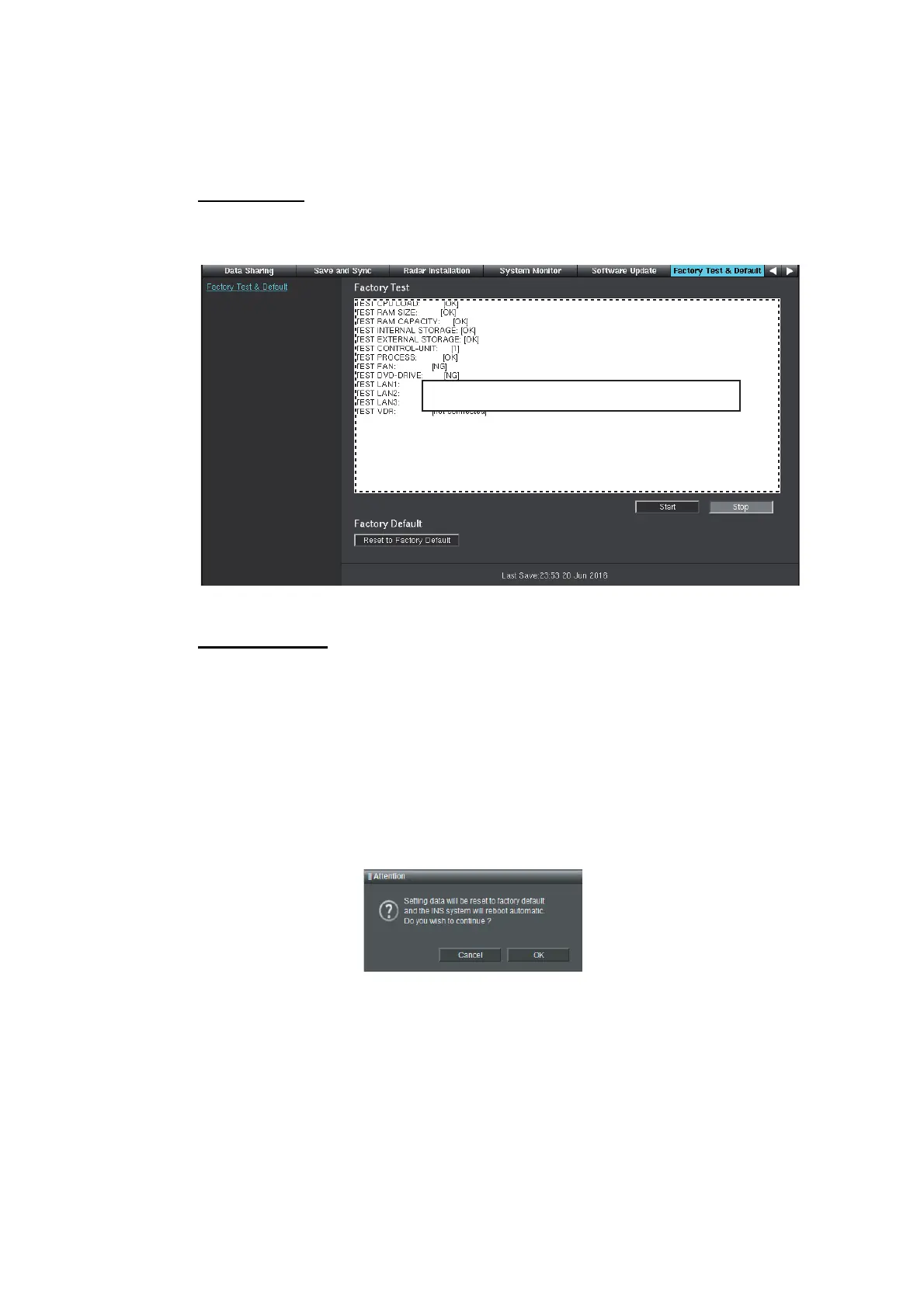 Click [Start] to perform the factory test. The result of the test is shown on the display.