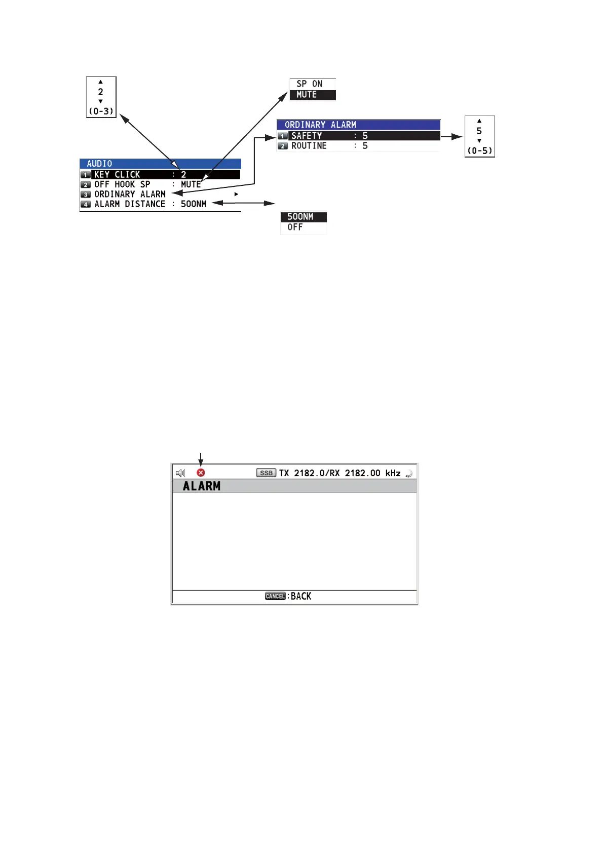 Rotate the ENTER knob to select [ALARM] on the [MENU] screen then push the knob.
