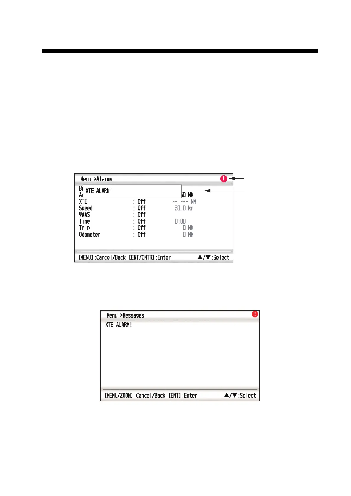 alarm, Anchor watch alarm, XTE (Cross-Track Error) alarm, Speed alarm, WAAS
