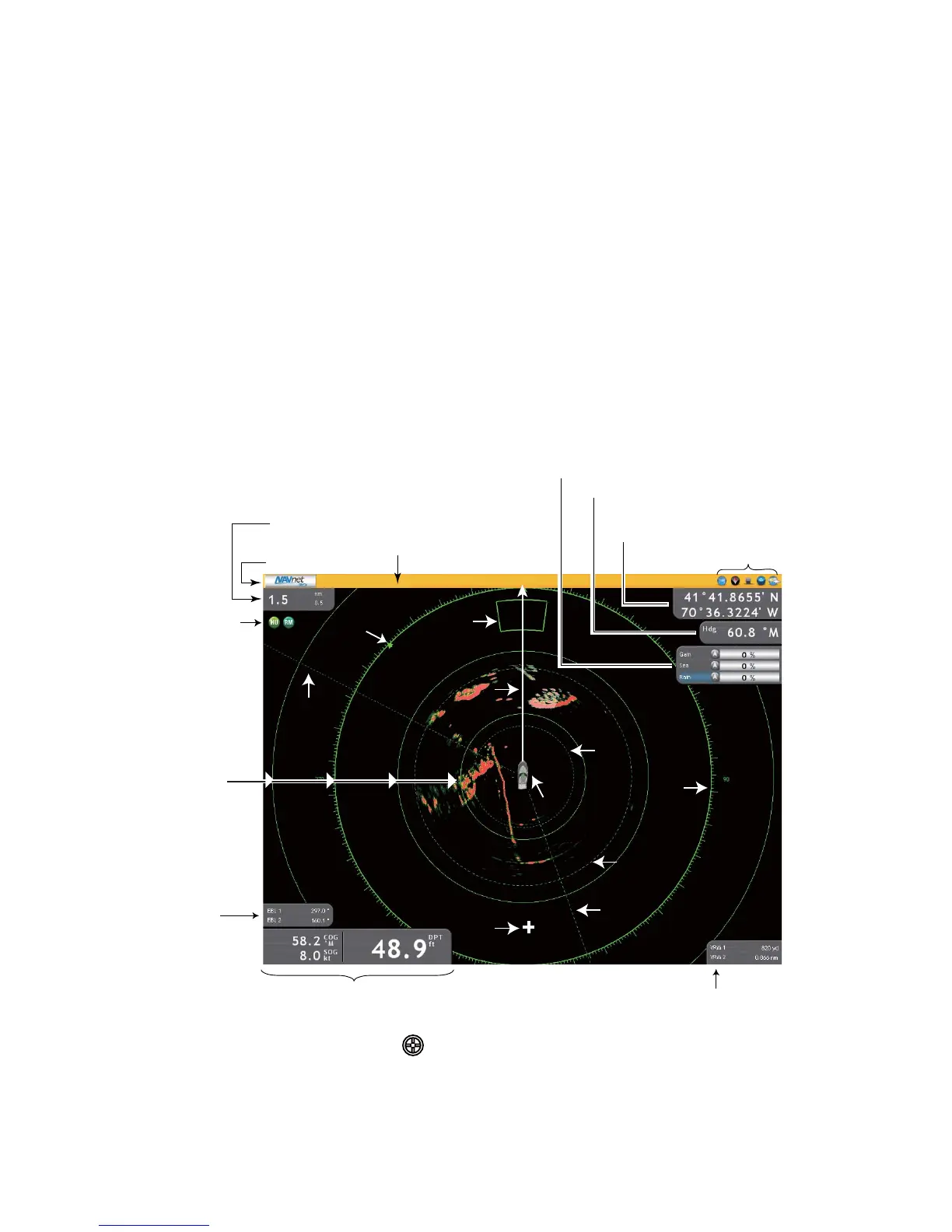 The radar display is available in head-up, course-up and north-up modes and orienta-