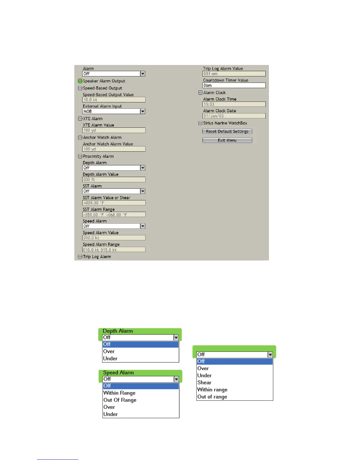 b) For the depth, speed and SST alarms, select the combo box of the item then