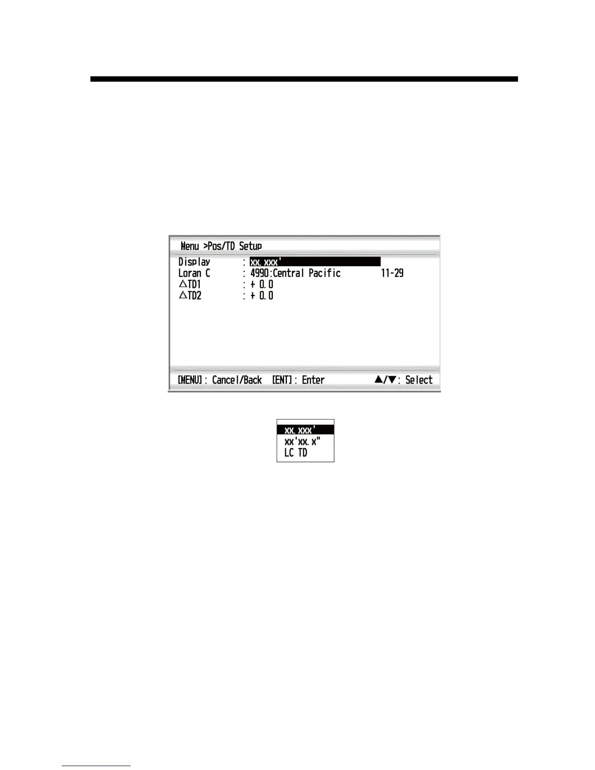 4. Use the Cursorpad (S or T) to select [xx.xxx’], [xx’xx.x’’] or [LC TD] then press