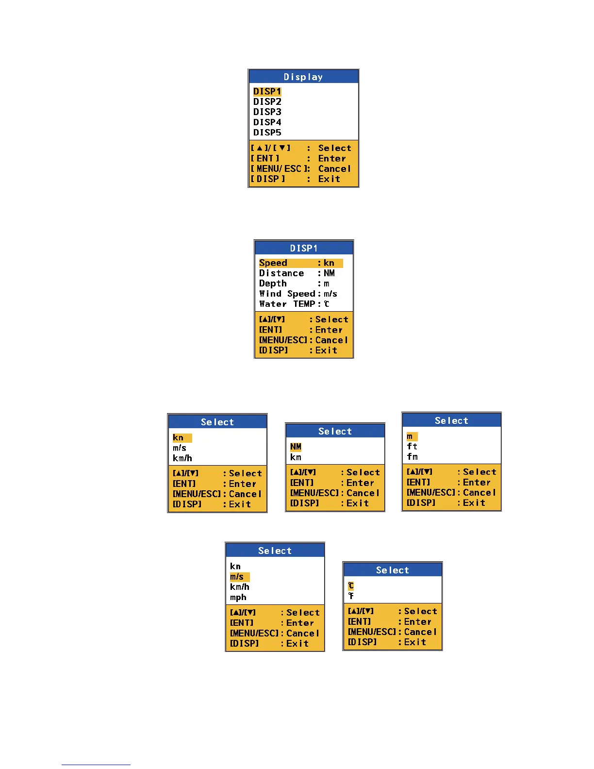 4. Press S or T key to select [DISP1 (2, 3, 4 or 5)], for which you preset the units