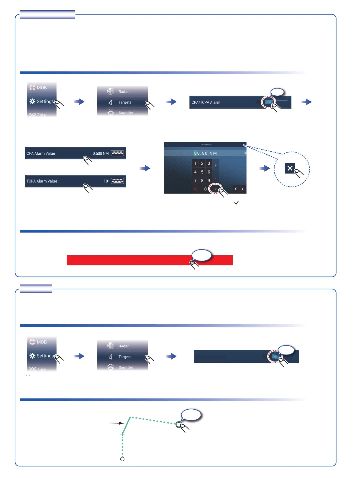and TCPA of a tracked target are equal to or lower than the CPA/TCPA alarm setting.