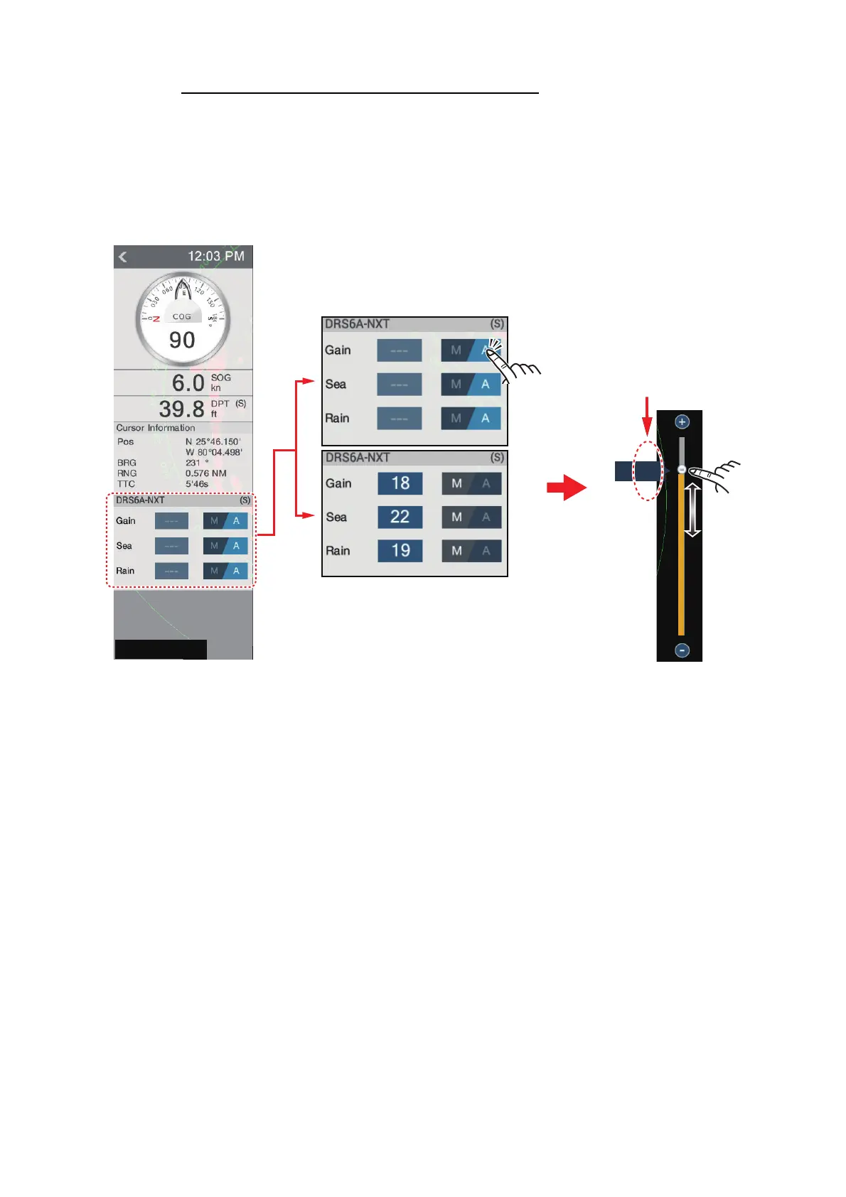 The gain can be adjusted from the data area, with the [Radar Control] box in the [RA-