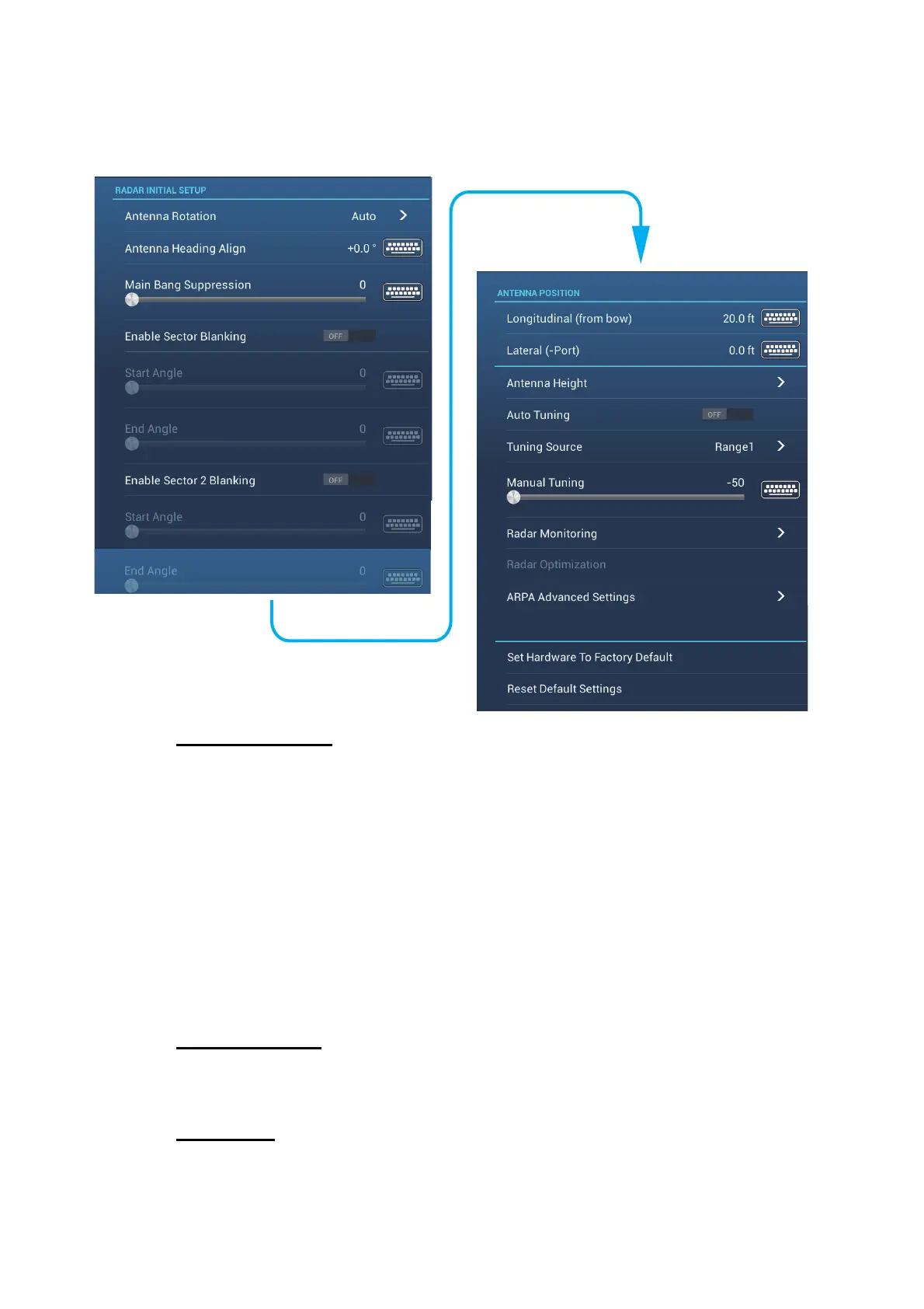 [Antenna Height]: Set the height of the radar antenna above the waterline. Not avail-
