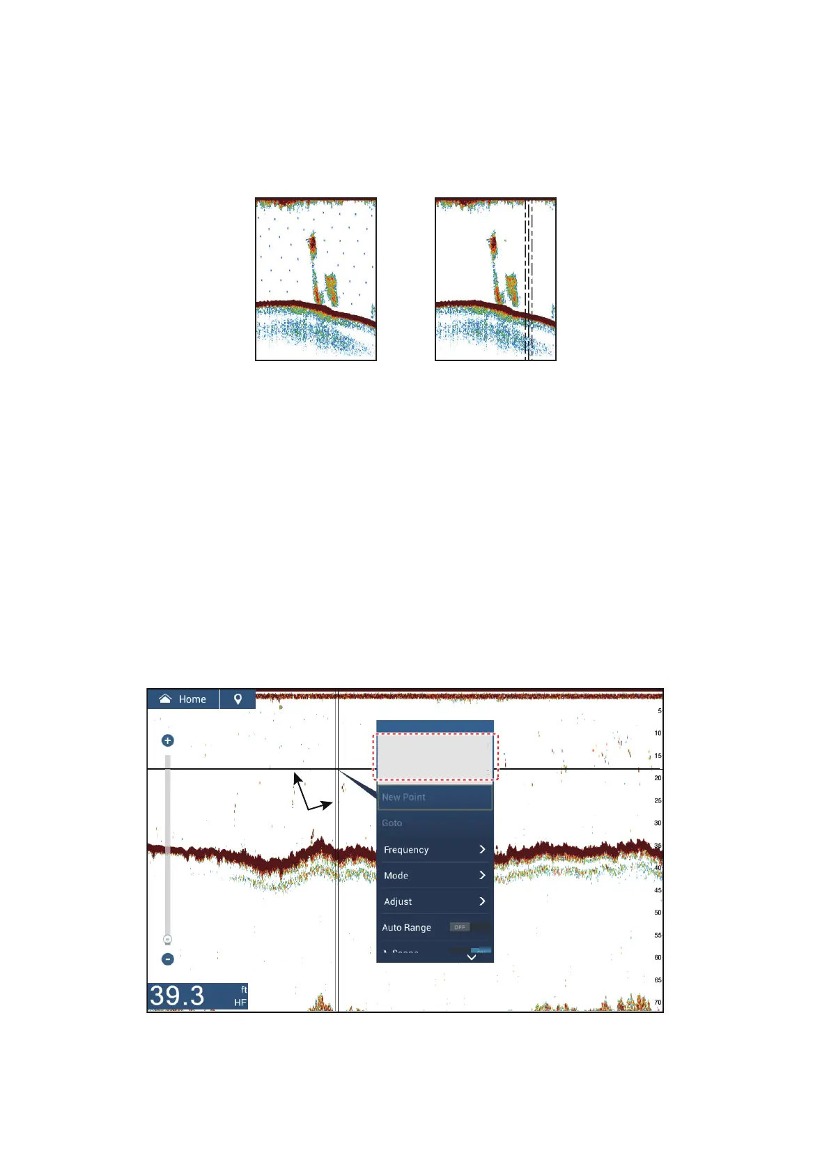 Tap an object to display the VRM. Read the range and depth in the pop-up menu.