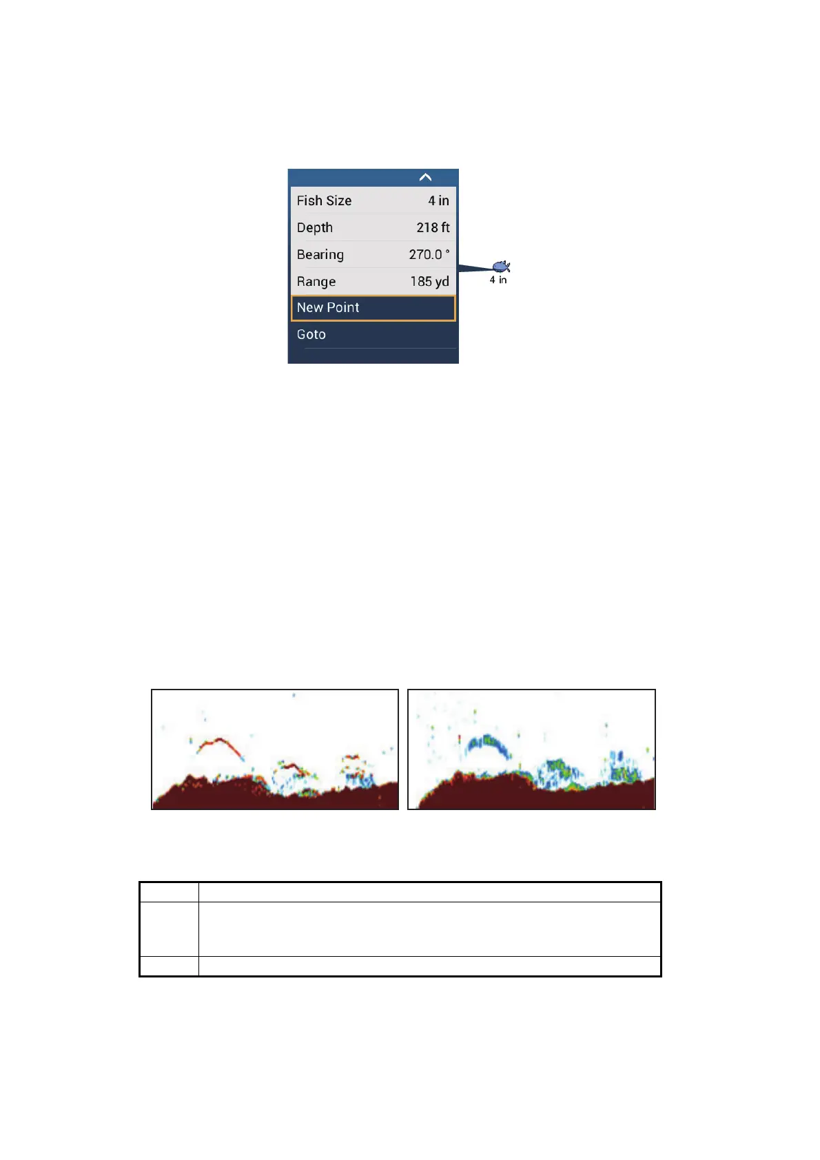 Tap a fish symbol to display the information (size, depth, bearing and range) about the